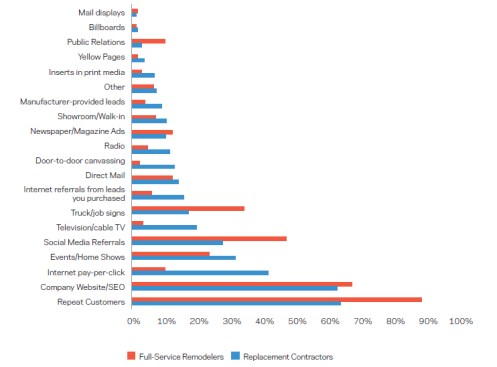 Lead generation sources for remodeling firms are wide and varied, with digital channels gradually gaining on the most tried-and-true source: repeat business. Compared with full-service firms, replacement contractors lean far more on internet pay-per-click, home shows, television, radio, and (still in this day and age) door-to-door canvassing. Full-service firms lean heavily on job signage, social media, and website traffic.
