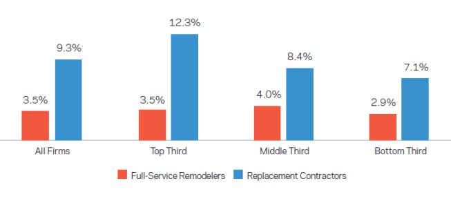 Marketing costs. Replacement contractors spend on average nearly three times more on marketing (measured as a percentage of revenue in the chart below) than full-service remodelers. Although the difference is not evident in the two charts on this page, company profiles show that in the top 100, replacement contractors have, on average, about 10 times the number of employees dedicated to marketing than full-service firms.