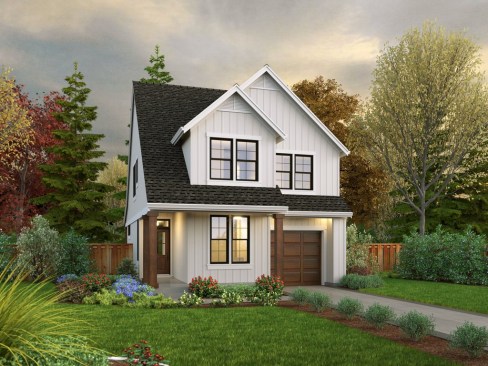 With on-trend modern farmhouse styling (still super-popular!), this 1,899-square-foot design will turn heads. The simple layout inside continues the contemporary feeling, with the kitchen flowing into the great room. The main suite sits on this level. Upstairs, two more bedrooms share a hall bath. The mudroom on the way in from the two-car garage is a nice touch. See more images, information, and the floor plans.