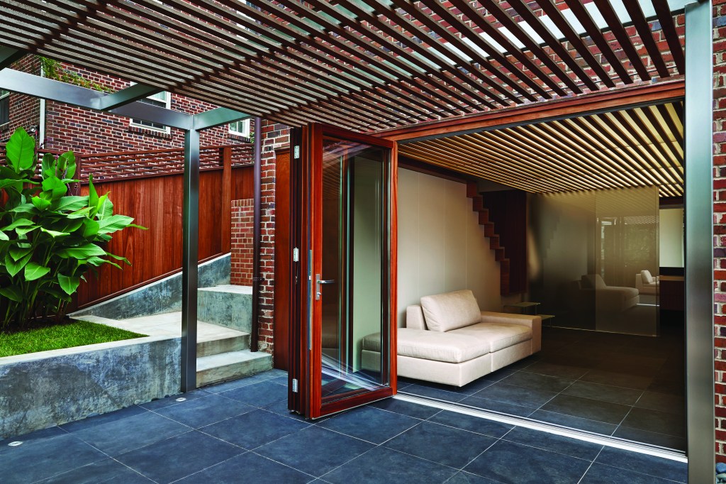 In this Washington basement, it’s hard to tell where the outside ends and the inside begins. Contractor Mike Madden, of Madden Corp., and architect Janet Bloomberg, of Kube Architecture, transformed the space into a modern open-air escape where their clients could relax after a busy workday. A continuous steel frame and teak slat ceiling seamlessly connect an outdoor garden pavilion to a sleek indoor floor plan. This cohesive design gives the interior a larger feel. The folding glass wall, by Nanawall, allows homeowners to easily expand or close off the space. Inside, a movable frosted glass door by Potomac Woodwork separates the bathroom. To keep the space looking modern and clean, a teak wall hides storage under the mahogany stairs.