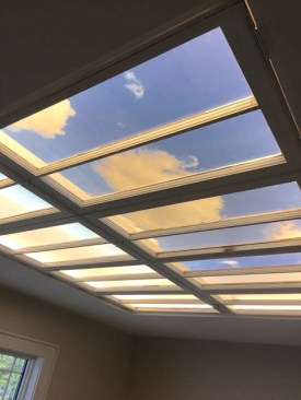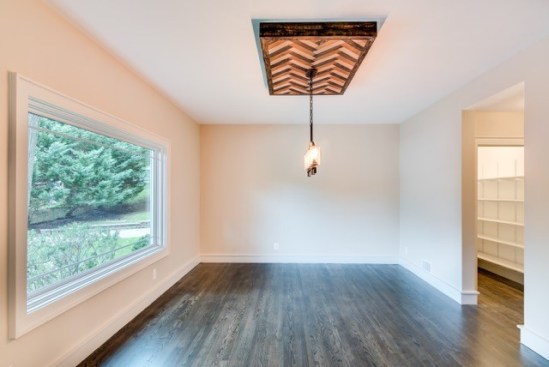 Don’t let this ceiling fool you; it’s not actually a skylight. During demolition, Khreshi decided to reuse the home’s old, sturdy wooden windows and told his crew, “Let’s make art out of this.” The team created this recessed ceiling in the library using the windows as a frame for the faux sky. They installed hidden LED lights so that the light shines above the old windows and back down into the room, mimicking the effect of a skylight. The crew attached hinges to the windows so that homeowners are able to open the windows and change out the LEDs.
