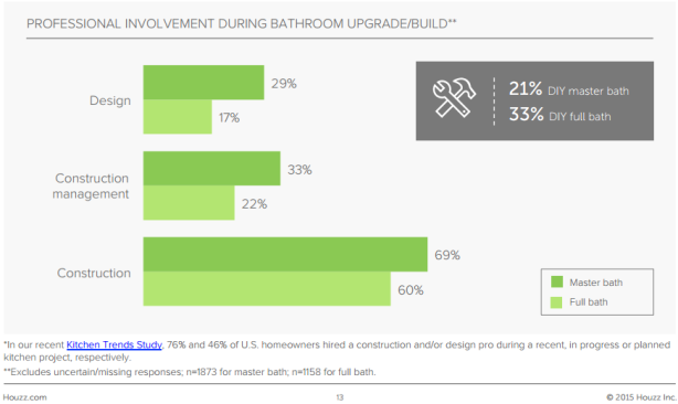 These numbers are based on an online survey conducted in February of 3,189 homeowners registered as Houzz users in the U.S. The homeowners who were surveyed finished a bathroom project in the past 12 months, are in the process of one, or plan to start one in the next three months.