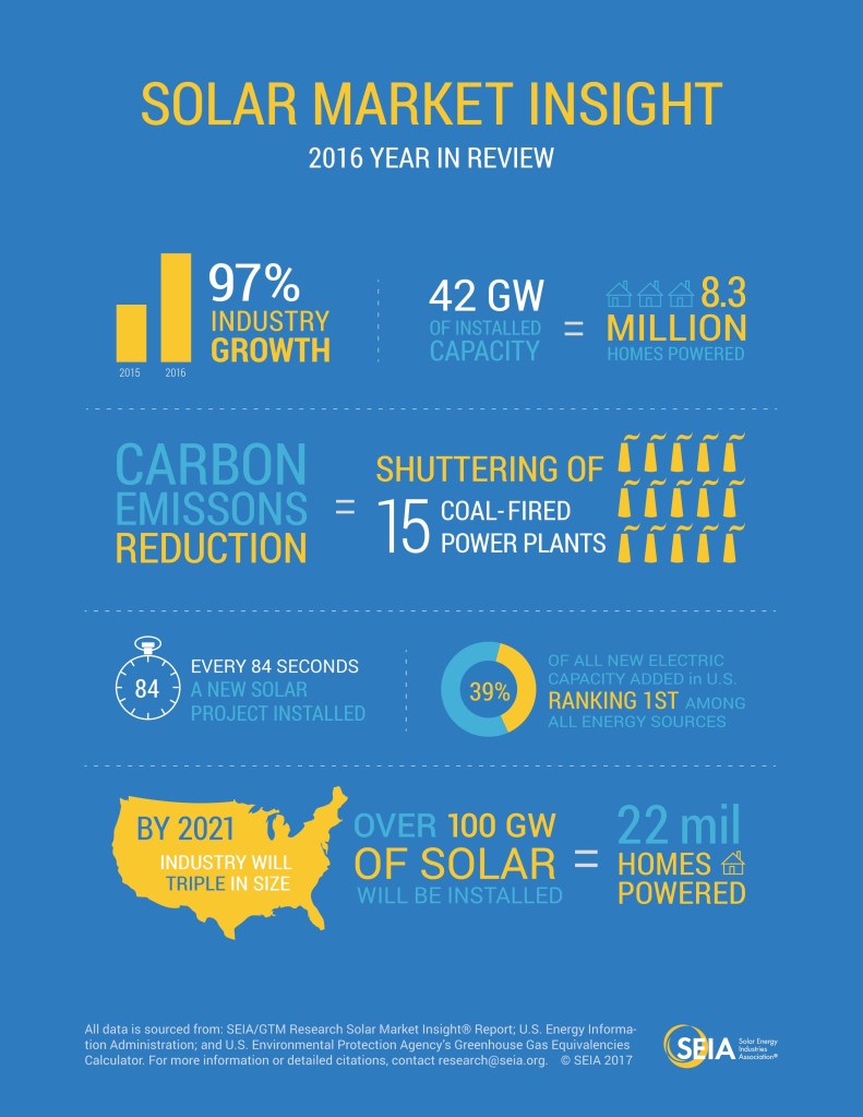 “It would be hard to overstate how impressive 2016 was for the solar industry,” said Abigail Ross Hopper, SEIA’s president and CEO. “…While the market is changing, the broader trend over the next five years is going in one direction — up.” In terms of dollars, the U.S. solar power industry has exploded from $42.8 million in 2007 to an expected $210.4 million by 2017, according to Statistia.