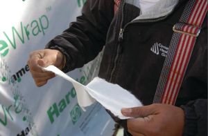Dupont, the parent company of Tyvek, manufactures a family of small-gap housewraps. Two that I use are Tyvek Drainwrap and Commercial Wrap D. The main differences between them are that Commercial Wrap D is slightly tougher, and it has a longer UV-exposure time, so it will last longer if it’s going to be a while before you install siding. Both have a slight, almost crinkled corrugation, which when installed properly creates vertical channels for water to run out. Regardless of how tightly the siding is attached to the sheathing, Drainwrap and Commercial Wrap D create enough of a space between the back of the siding and the wall for water to drain away.