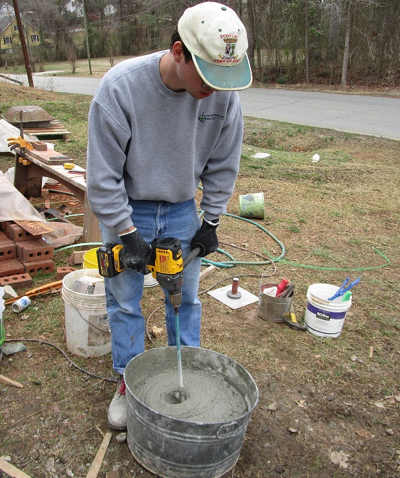 At first, the keyed chuck was a source of frustration, as the mixing paddle frequently came loose as I mixed the mud. My theory is that the paddle is worked free by the stresses applied in forcing the paddle through the dry mixture as I mix it into the water as well as moving it up and down to get and keep the stuff at the bottom of the tub mixed. So I tried to be a little more careful with how much mud I mixed up at once, and with the sequence in which I combined the materials. Instead of adding water to a dry mix, I measured the water and poured most of it in the bucket at the beginning, then mixed in half the sand and all the dry masonry cement to make a soupy slurry. Finally, I put in the balance of the sand, which seemed to produce a good workable mix without straining the machine. I also cranked the chuck as tight as I possibly could (using both hands) to get the mixing paddle to stay put, and that aggravating problem was put to rest.
