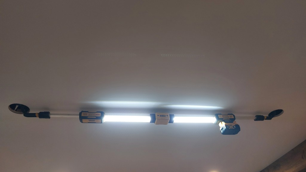 Lighting can be a challenge on jobsites. Task lighting poses even more of a problem, as most available lighting solutions cast light around the space and not down onto your tools. Ideally, I want a light that I can set above a miter saw to cast downward, and I want it to be cordless so it doesn’t use scarce outlet space.
