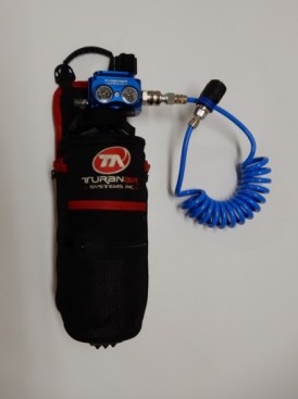 The Turanair System is basically a compressor in a bottle. It has an output pressure of 150 psi, and is packed inside a 114-cu.in. cylinder (like a mini scuba tank). The cylinder stores up to 4,500 psi of high-pressure air, which is regulated from 0 to 150 psi by the two-stage regulator.
