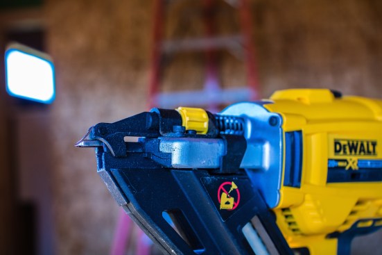We found that the driver pin kept getting stuck when we were shooting HD galvanized 2 ½” nails. On top of the gun is a lever to reset the driver pin (photo, left), which makes getting out of a jam fairly quick. It seemed we had trouble with just that batch of nails. We also had one nail jam and get bent in the nosepiece, but that was easy to fix. DeWalt has an Allen wrench on the gun that made it easy to remove two screws and pop the magazine off. It is common for us to miss on thicker hardware and the nail to bend in the nosepiece. This has happened with every gun we’ve tested, but DeWalt makes it easy to quickly fix.