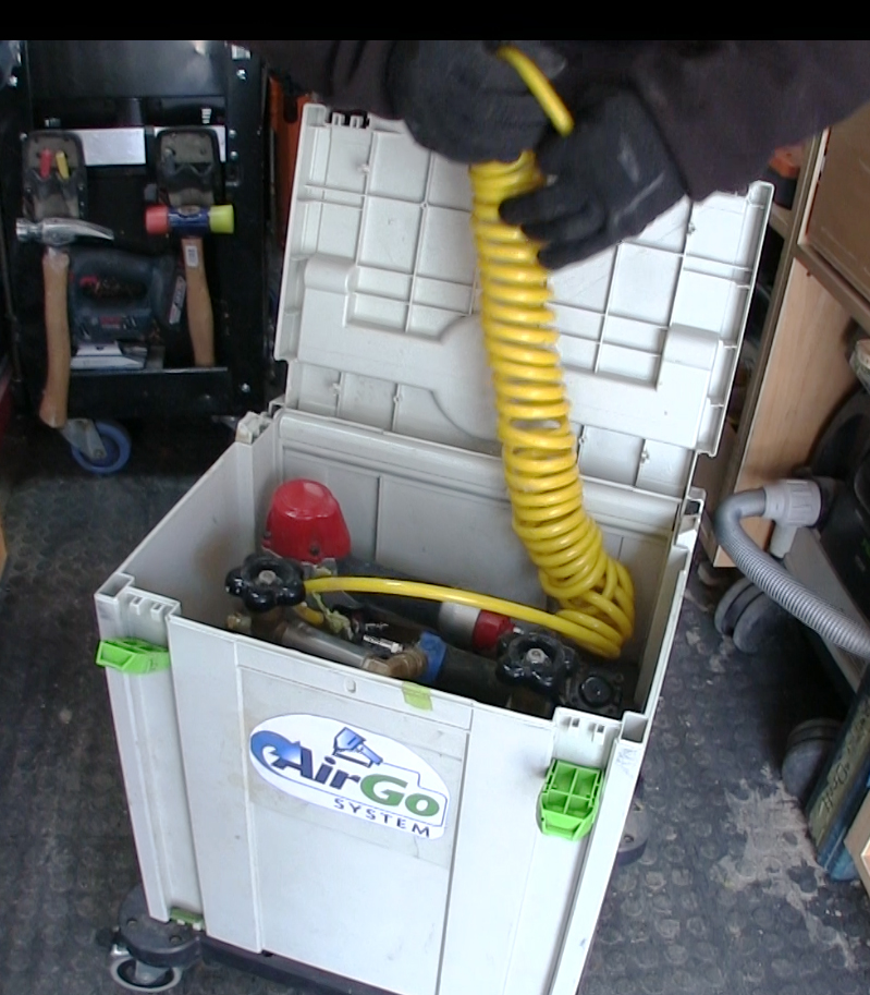 The most interesting thing about the system isn’t the tank and regulator, because similar products are available from a number of vendors; it’s the way components are packaged. Way rigged the interior of a Tanos Systainer to hold two 10-pound bottles, a pair of small nail guns, and a coiled hose. The Systainer is on wheels so he can pull it behind him when he works.