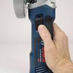 There are three types of grinder switches. The trigger switch on the DeWalt (left) can be locked off but not locked on so it offers the least amount of grip flexibility. Bosch, (center), Hitachi, Milwaukee, and Ridgid feature lock-on slider switches. These offer the best freedom of motion for both the tool and your hand position. But if the grinder were ever to get away from you while running, look out! The Metabo (right) and Hilti have paddle switches, also called a “dead man switch” because if you let go of the tool, it stops. There’s a safety lever that must be pushed for the switch to work to prevent the tool from turning on if it’s set down on its trigger. Once on, you can move your hand around somewhat as long as it’s still holding down the switch, so it is possible to choke up on the tool to shift your grip forward.