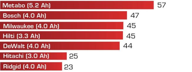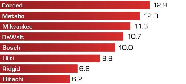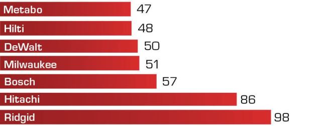 The Metabo takes the top spot, as it won every single power, speed, and runtime test. It also has advanced features. In the No. 2 spot is the Milwaukee, with a great combination of power when it counts the most and many advanced features. Great performances by Bosch and Hilti have them sharing third, and the powerful yet clumsy DeWalt follows. The light-duty Hitachi was a comfort standout, especially for finish work, but is really not in the same class as the more powerful tools above. The Ridgid trailed behind all with its timid output, doomed by a load limiter set too far below the level of work a cordless grinder needs to do.