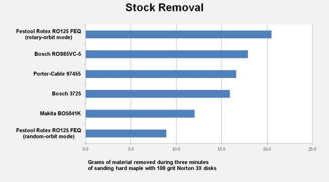 The Festool sander has two modes and was tested in each. The amount of stock removed was determined by weighing boards on an electronic scale before and after sanding. The amount of weight lost is the amount of material removed.