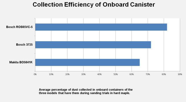 All of the tools can be connected by hose to dust collecting vacuums. Both Bosch models and the Makita come with onboard containers for collecting dust. Onboard collection is not as efficient as using a vacuum but is better than using nothing. Collection efficiency was determined by weighing boards and canisters before and after sanding. If all of the weight lost by a board was gained by the canister, then the sander would be 100% efficient. No sander came close to that but the top performer (see chart below) did not do badly.