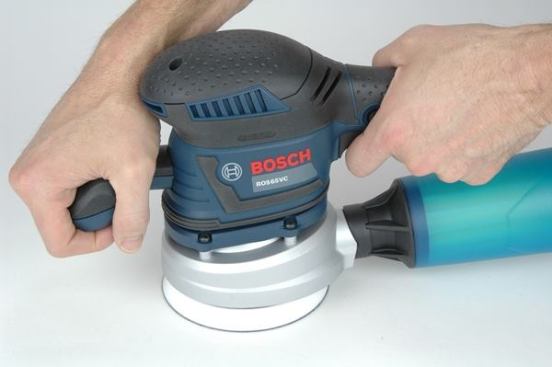 The benefit of rear-handle sanders (more accurately, dual-handle sanders) is illustrated in this photo of the Bosch ROS65VC-5 in hand. It’s easier to apply a balanced downward force on the tool with both hands rather than just one. It is also less fatiguing to the user during long sanding sessions and provides much greater steering control on uneven surfaces. For a detailed review of this model see Bosch ROS65VC-5.