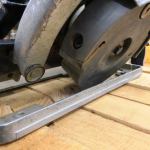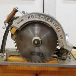 I’m not sure what the connection is between Holz-Her (now a Ge… I’m not sure what the connection is between Holz-Her (now a German brand of industrial woodworking machinery) and Festool. I like this saw for its wooden grip and the depth adjusting mechanism, which locks with a simple wingnut and has a finely graduated scale. Note the wooden wedge used to jam the guard open in the time-honored (and unapproved) manner.