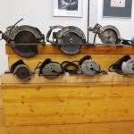 Here’s another look at the circular saws. Festool invented the… Here’s another look at the circular saws. Festool invented the plunge cutting track saw in 1964 though saws that ran on or were adapted to tracks go a lot farther back. Look closely and you’ll see that the third saw from the left on the lower level (an early 1950s model) is attached to a short section of track.