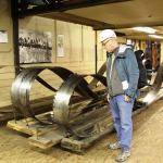 Here I am in the sharpening room—checking out the largest band saw blades I have ever seen. These are dull and waiting to sharpened. If necessary, they will be re-tipped. Re-tipping means re-grinding the gullets and using a machine to weld on new Stellite tips. Stellite is an alloy similar to carbide; it's tougher but not quite as hard.
