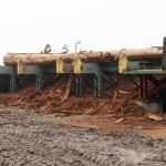 Whenever possible, logs are debarked prior to being sawn because when trees are felled and dragged they become caked with dirt and grit, which greatly shortens the life of the blades used to turn them into lumber. These logs (which have already lost some of their bark) are waiting to be run through the debarker.