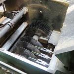 This is the inside of an edger; the blades can be positioned anywhere along the splined drive shaft and can be adjusted on the fly through the use of hydraulic cylinders. The closely spaced blades on the right side of the shaft are fixed, and are set up to rip 2-by out of a thicker piece. The blades on the left are the ones the operator is adjusting in the previous photo and video.