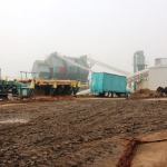 The silver building on the right contains grinding machinery, which grinds all of the bark, sawdust, and offcuts from the mill and makes them into a mulch mix. The mulch is conveyed to overhead bulk bins—the green structure to the left of the truck—and from there dropped into the open top of a semi-trailer.