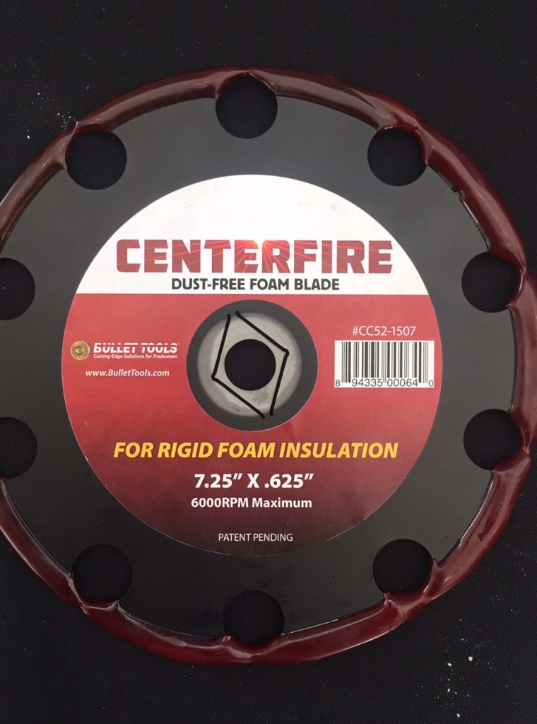 There aren’t a lot of cutting options for rigid foam, especially ones that do so without spraying blue or pink colored dust. So we were intrigued to see the redisigned Centerfire blade from Bullet Tools at JLC Live this week; it comes in a 7 1/4-in. and 10-in. version. The blade wasn’t being demonstrated at the JLC Live event, so we didn’t get to see it in action. But those of you who were at IBS this year may have seen it there where Bullet was running rigid foam through a table saw. These blades aren’t new, but this redesign is. The new design has a ceramic coating, which Bullet says keeps the heat down on the blade, and prolongs the life.