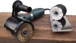 Though originally designed for metal work, we found that the power, mobility, and variety of abrasive options of the burnisher worked well on wood surfaces. The Metabo excelled at removing dirt from the hand-hewn texture of timbers without abrading away axe marks and other original surface features. The wire-brush wheel removed dirt quickly and left a slight raised-grain texture. Its aggressiveness let us work faster than usual, saving time and money, and it seemed to wear very well. The grit-coated nylon brush is similar to what we’re used to; it also cleaned surfaces well, leaving them smoother than the wire brush. The harder abrasive wheels and flap sanders seem better suited for smooth sanding, not our restorative finishing style.