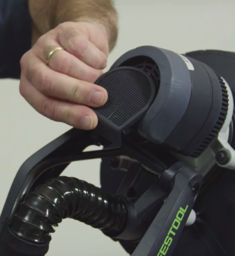 Before you store the sander at the end of the job, Festool recommends vacuuming the backing pad of the sander. It is also a good idea to store the sander with abrasive on the pad. This keeps the pad from taking up any miscellaneous debris in storage. Also, a light puff of compressed air (low pressure) to the head and body of the sander is helpful. The motor itself has a protection screen to help keep large debris (drywall bullets) from entering. This screen may need to be removed and cleaned occasionally.