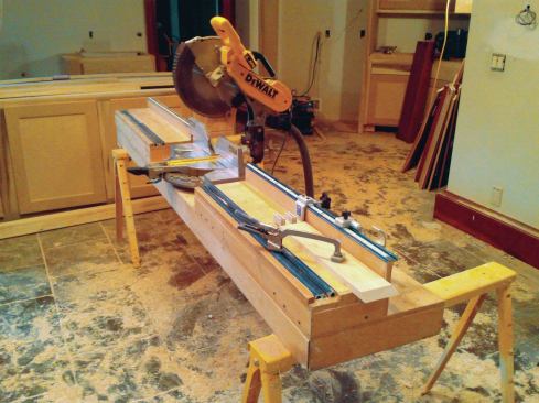 Risinger Homes, in Austin, Texas, uses this basic 7 ½-foot stand for most of its finish carpentry. Made of ¾-inch plywood, the lightweight stand is easy to carry and fits in a pickup bed. The stand sits on sawhorses, and solid tables on either side of the saw provide several feet of continuous support. A power strip mounted on the back of the stand allows it to double as a workbench. The saw’s fence aligns the workpiece, so no additional fences are required.