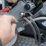 To meet newer OSHA standards, the saw has a vacuum hose adapter that fits onto the upper handle and will accept 1 7/8- and 2 ½-inch hose ends. The saw also comes with a water delivery system that is very quick to install. Basically, the end slides into position behind the blade and one screw is tightened to hold it into place. One end of the blade wrench, which stores in the base plate, turns that screw. In practice, the water delivery system worked exceptionally well; we just turned the valve to start the flow of water and started cutting. Water doesn’t come gushing out but is controlled and does a great job of eliminating nearly all the dust.