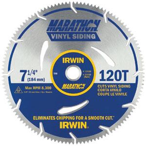 The Irwin Marathon vinyl siding blade is the first designed for circular saws, according to the manufacturer. Its symmetrical, 60-degree tooth design eliminates chipping and cracking and provides a smooth finish when pushing or pulling through the cut. The 7-1/4-inch, 120-tooth blade is heat-treated to resist warping and wear. It can also cut all types of thin-wall plastic building materials, including lattice, fencing, gutters, and PVC pipe. Price: $9. 704-987-4827.