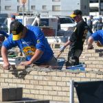 Masons and tenders hard at work in the Bricklayer 500 contest. The mason who lays the most brick in an hour wins.