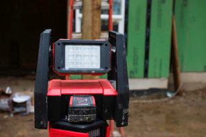 This flood light is very durable especially compared with the old halogen portable lights we always broke too readily. A roll cage protects the light and still allows for the light to be moved 240°. It’s also very compact and portable at 11” x 12” x 8” tall. We found it extremely useful in crawlspaces and in work areas in a basement we had to frame. We found that putting the light on a block nailed between studs let us cast enough light to illuminate most smaller areas like bathrooms or bedrooms. It also did a great job of lighting up the cut station.