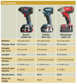 About a year ago I tested nine 18-volt impact drivers. Since then, a few new models — Bosch’s 25618-02, Makita’s BTD 144, and Milwaukee’s 2650-20 — have come on the market. This article is a review of these next-generation lithium-ion tools. My co-workers and I used the drivers on remodeling jobs and tested them for runtime. Each arrived in a kit that included two batteries, a charger, and a case.