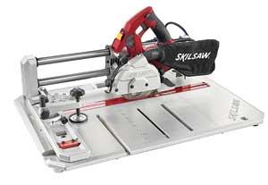 Using a table saw and a 12-inch miter saw on flooring projects is like using railroad spikes for nails – way too much tool for the job. The Skil Flooring Saw combines the functions of a table saw and a miter saw in one easy-to-carry 25-pound unit. The 7-amp tool slides along dual rails for square cuts and miters and locks into place for rips. An adjustable fence changes locations depending on the type of cut. With its 5-3/8-inch blade it can cut material up to 3/4 inch thick and make rips between 1 inch and 8-1/4 inches wide. The maximum crosscut is 15 inches for square cuts and 8-1/4 inches for 45-degree miters.