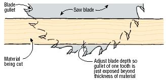 - A.Steve Dassoulas, a technical manager at DeWalt, responds: Both groups are partly right. It really depends on what the user wants — better finish or better blade life. For a given cutting speed, setting a deeper cut depth does increase blade life. A deeper cut is less stressful on the saw and the blade, because fewer teeth are in contact with the wood at any one time. The downside to this approach is that it increases the entry and exit angles of the teeth with the wood, which reduces the quality of cut finish. So if it’s finish you want, adjust the blade depth to slightly more than the thickness of the material. - Minimizing blade depth also improves safety. Keep in mind that kickback can occur when the back of the blade gets pinched. With less depth of cut, less blade area is exposed to the wood, decreasing the chance of kickback. Because there is always a risk that an operator can accidentally get in the way of the blade, reducing the amount of exposed blade improves safety. It also decreases the likelihood that the saw will cut unknown pipes or wires that may be hidden behind the material being cut. - For the best quality of finish and the greatest level of personal safety, set the blade so that the gullet of one tooth is slightly exposed beyond the thickness of the material being cut.