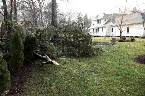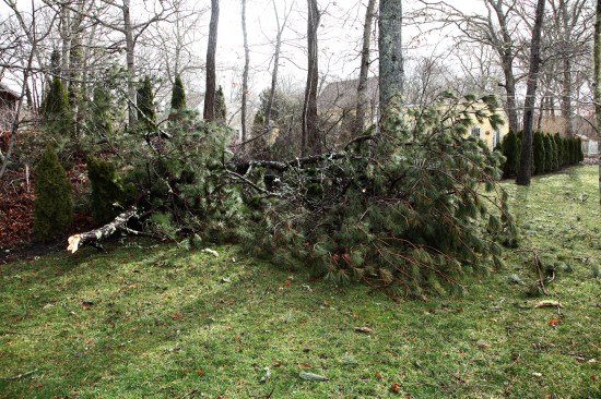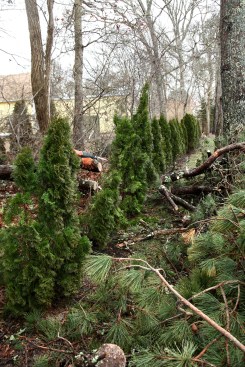 The next morning, I braved the wind and rain to check on my own place a couple of towns over. I arrived to find that a big locust tree in the hollow next to the house had snapped off a dozen feet from the ground. When I walked over to assess the damage, I discovered that a large pitch pine had fallen into my neighbor’s yard across a row of arbor vitae planted on the property line. Just moments after I got back to the house, he drove into the driveway, clearly upset at this big tree mashing his shrubs.