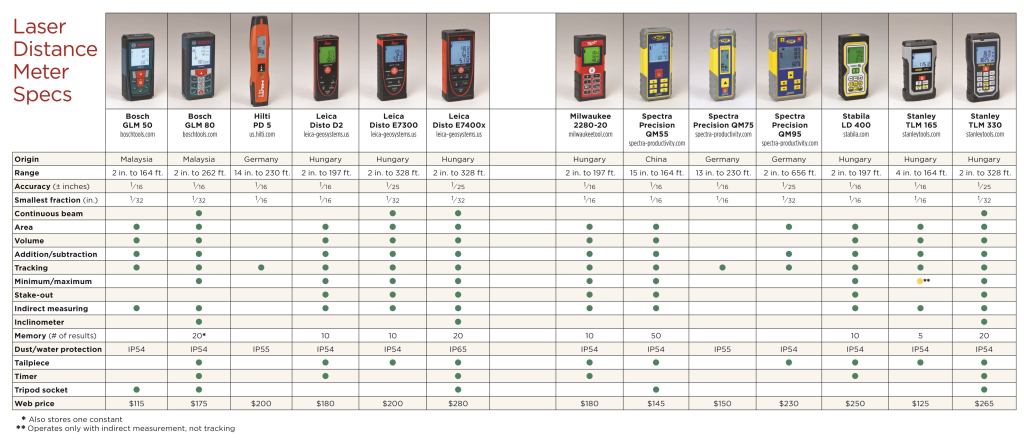 In the spec chart (pages 42 and 43), the new full-featured TLM 330 and Leica 7400x appear to be almost identical. But the Leica rates at IP65 rather than IP54 (which means you can hose it off), while the Stanley adds an extra Pythagoras function and a leveling mode that uses beeps to indicate level — handy if you can’t see the display. The Stanley also has four more keys for quicker access to several functions, but I think they clutter the keypad without significantly improving the tool. For instance, a new key makes it easier to calculate triangular areas (which I’ve never done), but you still need to use an obscure key combination to turn the backlight on and off. The Stanley currently costs about $15 less than the Leica, but comes with a two-year rather than a three-year warranty.