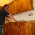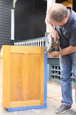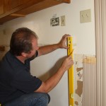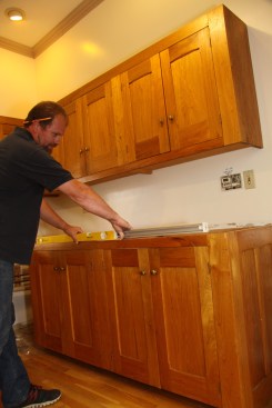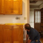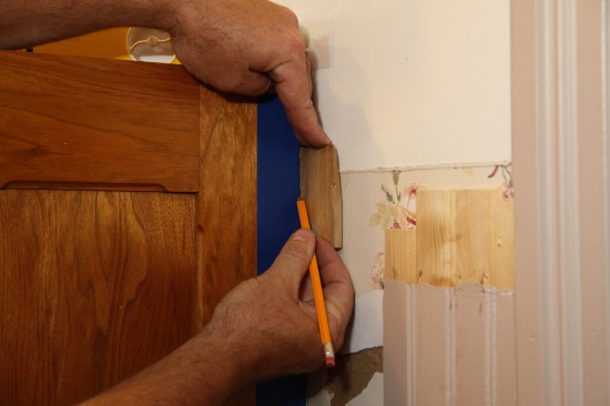 One job was part of a large renovation project we had been working on for months in an immaculately maintained historic Victorian. The cabinets were in good shape but weren’t installed well (the maple countertop was 1/2 inch out of level in 10 feet. The owner wanted us to relocate a base cabinet, shown here in the slide show, so it was a good place to illustrate some of our basic scribing techniques. Some may think them a little crude, but I can assure you that for a skilled craftsman, they are both efficient and effective. Most of the time this approach calls only for a small block of wood (the fat part of a shim, if we’re lucky) and either a circular saw or a belt sander. For long, straight tapers on end panels or face-frame styles, we also use a hand plane or power plane and bevel the cut so that the face fits tight to whatever we’re scribing to – which is the same idea when you’re coping trim: take a little more off the back than the front and you’ll get a crisp finish line.
