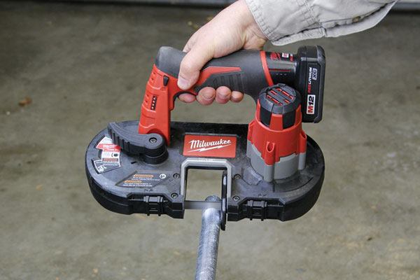 One question always comes up with new cordless tools: How much work can it do before you need to change batteries? According Milwaukee, the M12 band saw can make up to 150 cuts per charge in 3/4-inch electrical conduit with the supplied six-cell XC battery. Runtime is less with standard three-cell batteries.