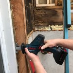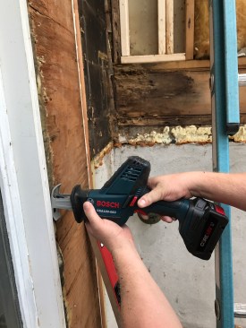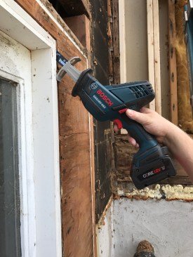 The second task was to cut out an old entry door with two sidelights, which required cutting the nails driven through the jambs into the rough framing. The rounded footplate of the saw allowed me to “roll” the front of the saw on the jamb and through the cut. Previous to handling the Bosch, I was much more familiar with a traditional reciprocating saw, on which the footplate is flat and only minimally pivots on the rivet that fastens it to the saw. The rounded footplate of the Bosch proved to make cutting much smoother with the blade buried into the work. For this task, we used the OEM Bosch metal-cutting blade and were far happier with its performance than the wood-cutting blade’s.