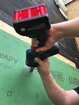 The first task that we used the recip saw for was cutting out the over-sheathed sections of window rough-openings. Wood framing was SPF 2×4 with 1 7/16-inch ZipR Zip System sheathing. The short and well-balanced design allowed for one-handed use of the tool, enabling me to place a free hand on the sheathing that was being cut. I found this be particularly valuable; I didn’t need to rely on a fellow carpenter or helper to handle dropping sections of sheathing after they were cut. My partner and I started cutting with the kit-provided OEM Bosch wood-cutting blade, but were not impressed. Cutting performance noticeably increased by swapping out the Bosch blade for a Freud Diablo blade.