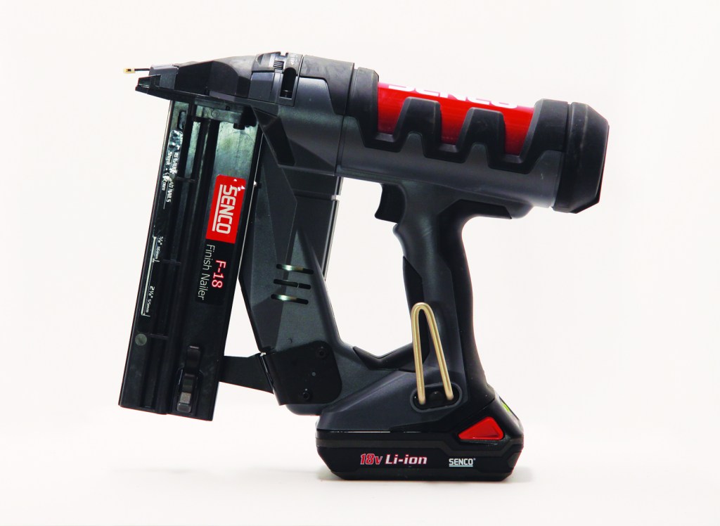 Comments: The Senco felt somewhat unbalanced, but it also offered a very comfortable grip when being fired with a straight wrist. A tall front housing makes it difficult to use in tight workspaces. The large head also blocks a direct line of sight, so accurate nail placement is difficult. It will only stand on its battery and relies on the nail magazine as a sort of kickstand. According to Senco, it will fire up to