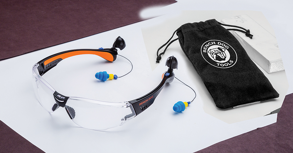 Rockler’s Bench Dog Sound Shield Safety Glasses combine protective eye lenses with earplugs tethered to the frame by cords. The glasses have clear plastic, anti-fog lenses. They’re available as standard safety glasses or as a “fit over” design for use over eyeglasses. The earplugs slide in and out of the frames by pulling either end of the cords. They store in compartments in the earpieces of the frames when not in use, which eliminates the hassle of lost earplugs.