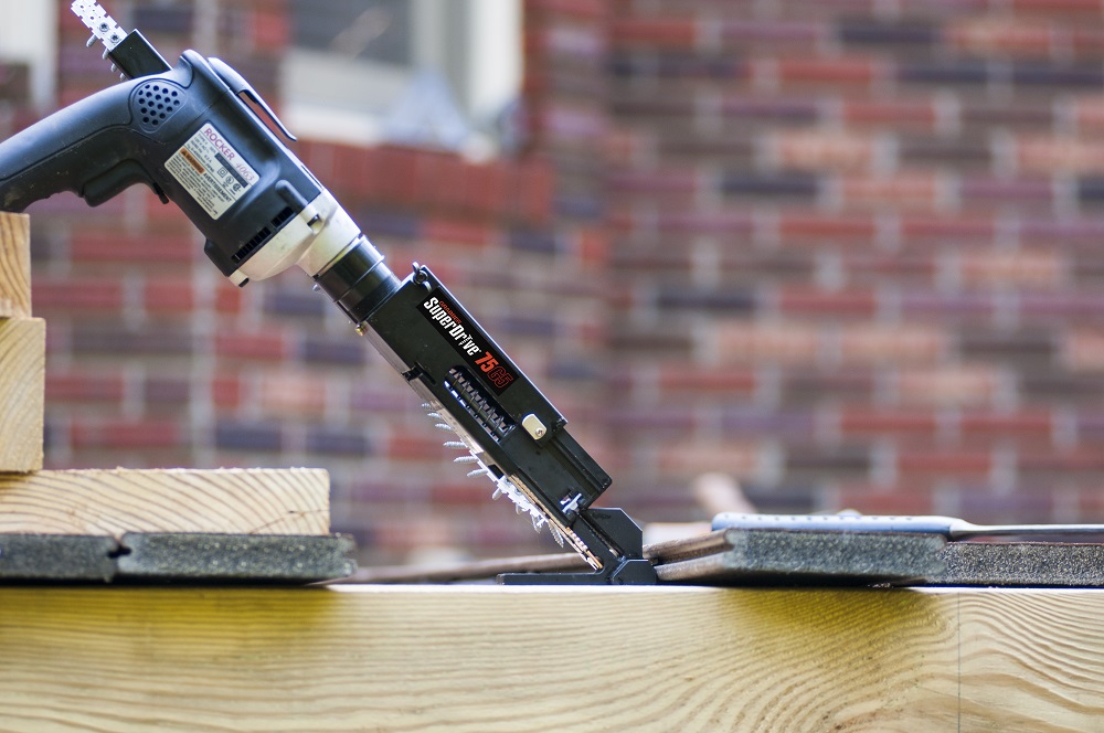 Designed specifically for installing deck clips, the SuperDrive 75G5 fastening tool effectively automates clip installation along joists. Available in a kit that includes the SuperDrive 75G5, a Rocker 4000 rpm screw gun, and feed track, the tool helps drive screws at the ideal angle and depth every time, while offering a compact and lightweight design. Installers can opt for the SuperDrive extension piece to allow for use from a standing position, and also can configure the tool for top fastening Each collated strip holds 50 screws. grabberman.com