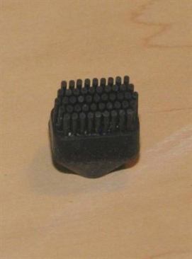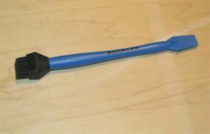 The tool consists of a plastic handle with a flat spatula-like spreader on one end and silicone bristles on the other. The bristles are about 1/16″ in diameter and very rubbery. Glue doesn’t stick very well to silicone, so if it dries on the bristles, it’s supposed to be easy to peel it off.