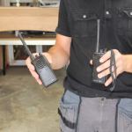 When we trim rooms with high ceilings I’ll be on the scaffoldi… When we trim rooms with high ceilings I’ll be on the scaffolding while my dad is at the cut station – which is frequently in a different room. I got tired of hollering dimensions and instructions back and forth between rooms so I bought a pair of 2-way radios (these happen to be Blackbox models – but any good brand would work). Now we each carry these radios on our belts. My Dad turns his up really loud so he can hear my requests while he’s at the cut station. The only problem is getting both parties to speak and respond with proper radio communication, these are not cell phones. “10-4”.