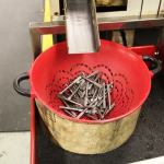 These Phillips blades have just been machined in a CNC lathe. They came down the chute at the top of the photo and landed in a kitchen colander—which allows the oil used in the machining process to drain off the pieces.