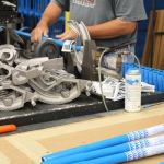 This worker is assembling 3/4-inch conduit benders; the wheels o…