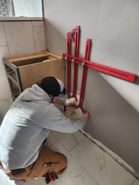 Kitchen sink cabinets also often have an outlet for under-the-cabinet electrical needs, like a garbage disposal. The Cabinet Plumbing Jig comes with a swivel head to mark the location of electrical boxes.