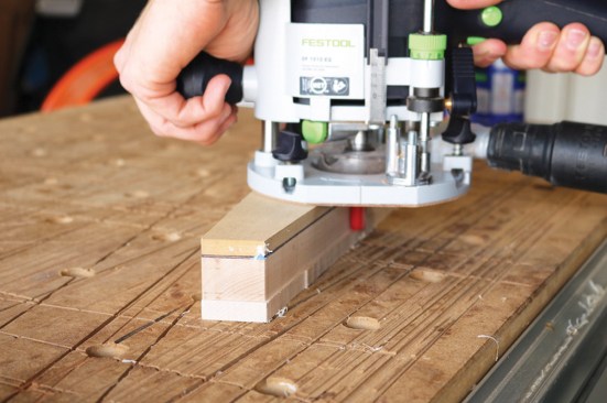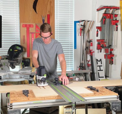 A few other techniques and jigs can be used when making dado or rabbet cuts, but my preferred method is using Festool’s guide rail and guide stop (model 492601). I find this method to be very safe, as I can clamp the guide rail to the workpiece and keep a hand on the router and guide stop.